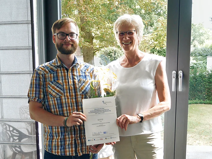 Zertifikatsübergabe Prorektorin Prof. Dr. Karin Holm-Müller überreicht das erste Zertifikat der Uni Bonn an Mentor Michael Evers. Foto zertifikatsuebergabe.webp image/webp Typ image/webp Dimension Abmessungen 708x531 Size Dateigröße 97.9 KB Herunterladen Bild in voller Größe anzeigen…
