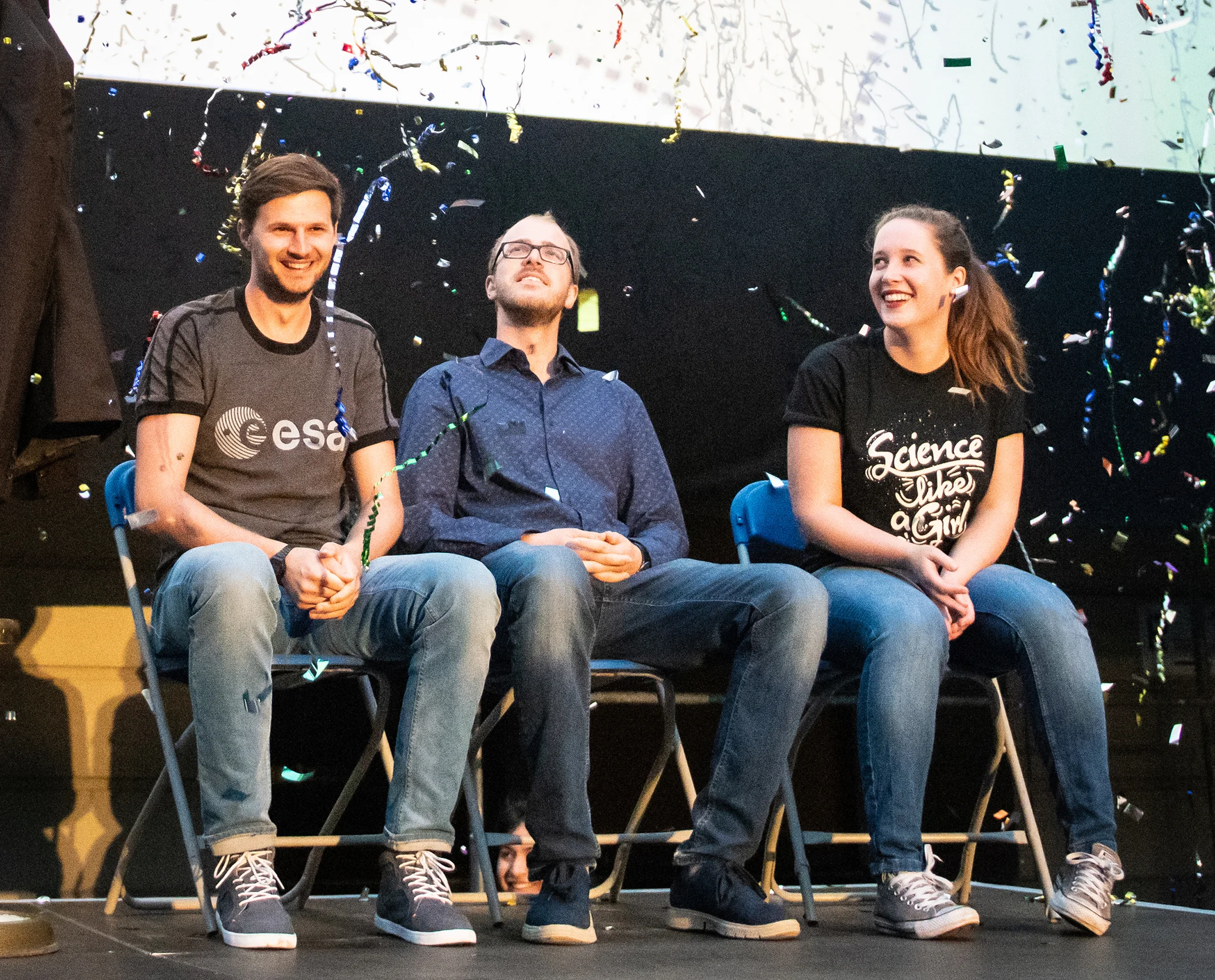 Die Slammer Dr. Roman Stilling, wissenschaftlicher Referent für die Informationsinitiative "Tierversuche verstehen" der Allianz der Wissenschaftsorganisationen (links). Rechts von ihm Jan Niklas Hansen, Doktorand am Institut für Angeborene Immunität der Universität Bonn, und Ann-Charlott Schneider, Doktorandin am Zentrum für Augenheilkunde der Uniklinik Köln.