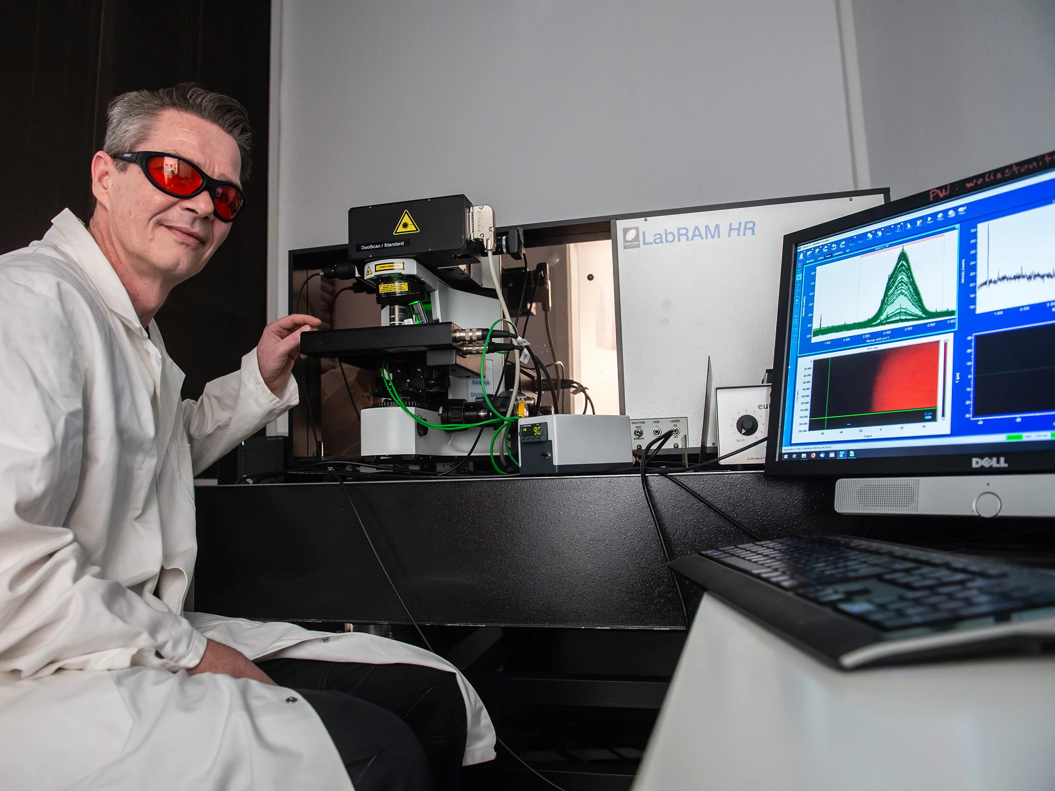 Prof. Dr. Thorsten Geisler-Wierwille vom Institut für Geowissenschaften und Meteorologie der Universität Bonn am Raman-Spektrometer mit eingebautem Heizgefäß.