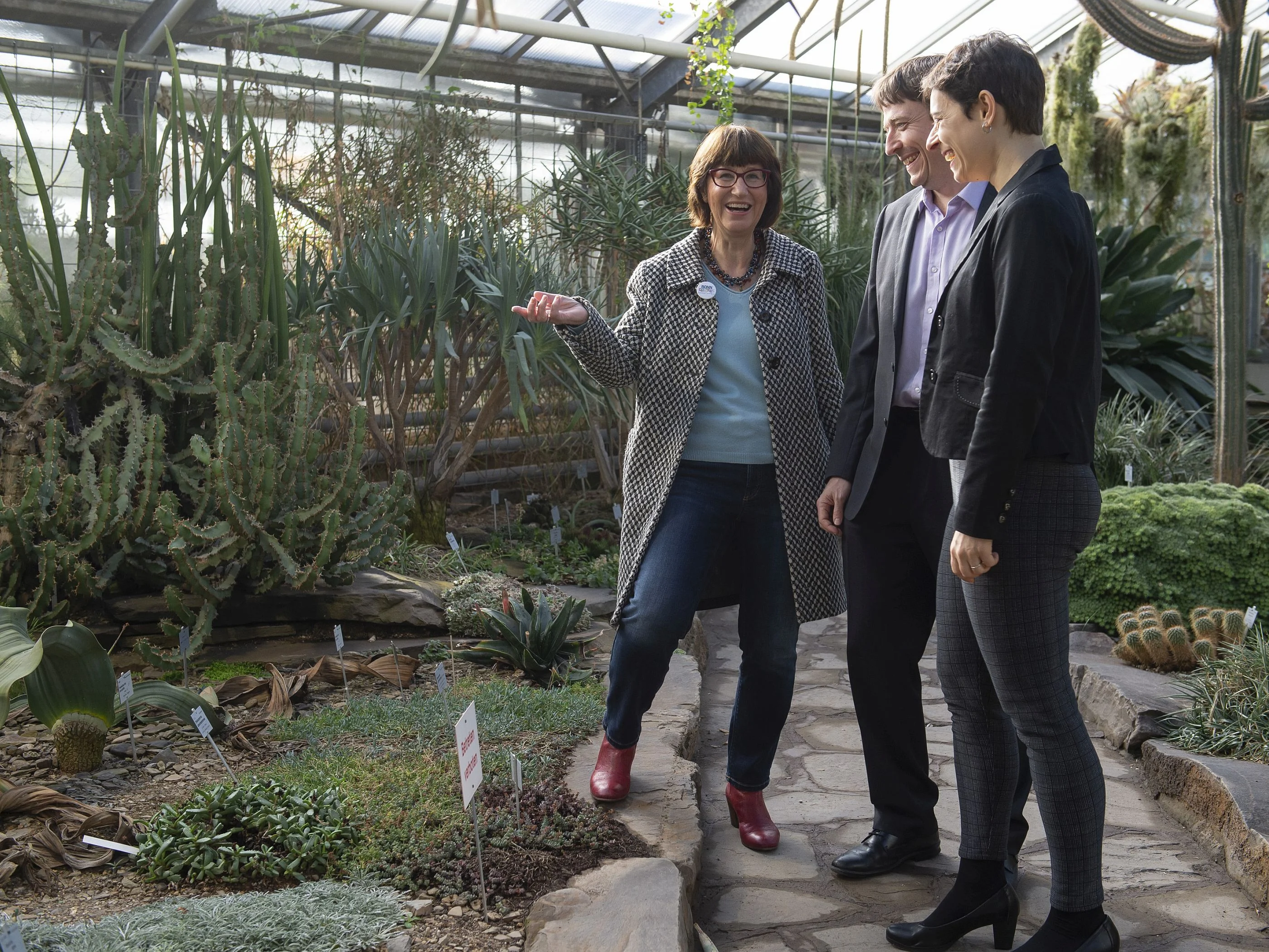 Bonn Greeter Sybille Düning (li.) stellt dem neuberufenen Bonner Professor Christ McCool und seiner Frau Valérie McCool das Sukkulentenhaus im Botanischen Garten der Universität vor.