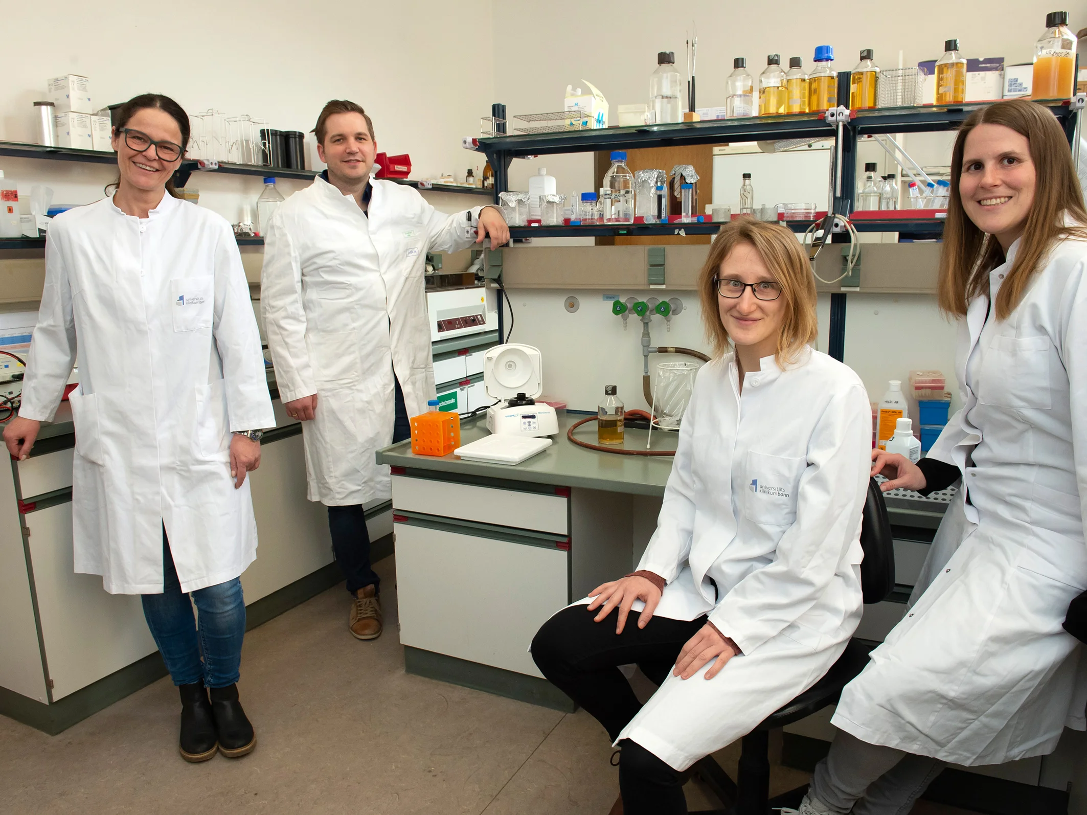 Haben eine Bakterienkapsel im Reagenzglas nachgebaut (von links): Prof. Tanja Schneider, Dr. Marvin Rausch, Julia Deisinger und Dr. Anna Müller. haben-eine-bakterienkapsel-im-reagenzglas-nachgebaut-von-links.webp image/webp Typ image/webp Dimension Abmessungen 2126x1594 Size Dateigröße 304.8 KB Herunterladen Bild in voller Größe anzeigen…
