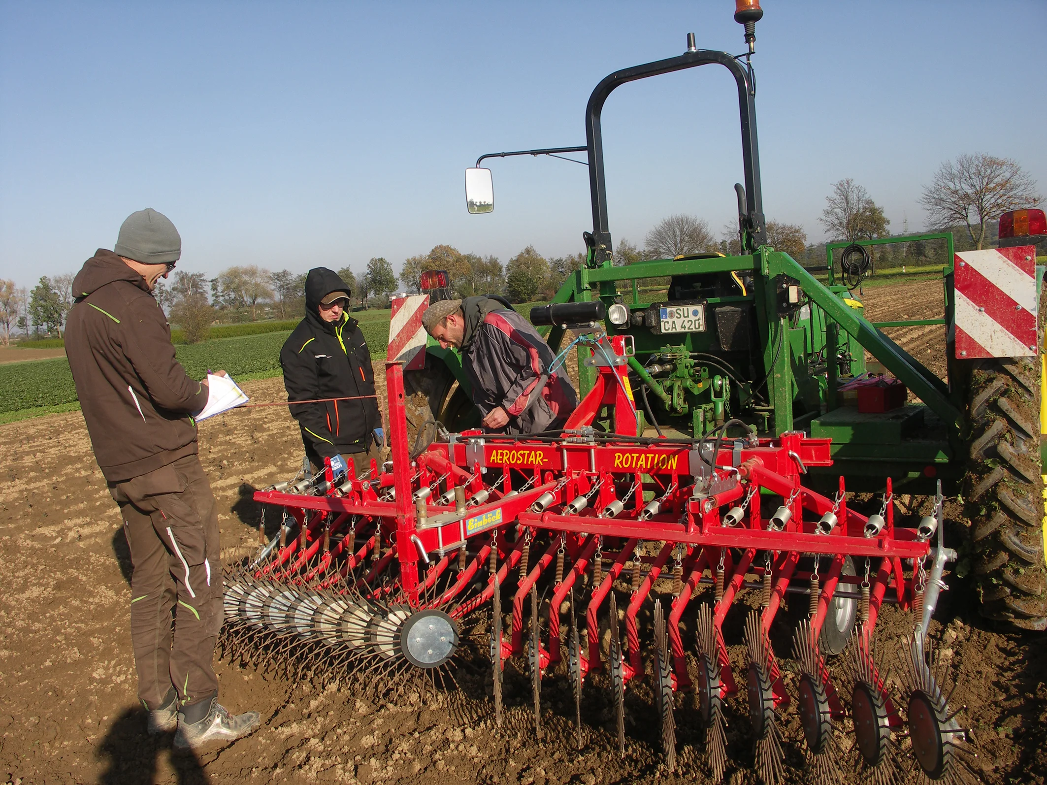 Spezialisten der Universität Bonn stellen auf dem Campus Klein-Altendorf den Rollstriegel Aerostar-Rotation ein, der ganzflächig über die frisch gepflanzte Versuchsfläche kämmt, um keimende Unkräuter zu entfernen.