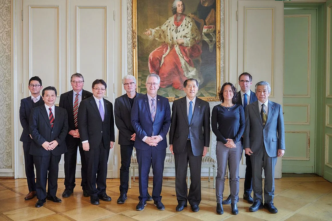 Vertreter der beiden Universitäten stellten sich zum Gruppenfoto auf. Unter ihnen Rektor Hoch (5.v.r.), Präsident Tanaka (4.v.r.) und Festredner Prof. Dr. Koichiro Agata (ganz rechts).