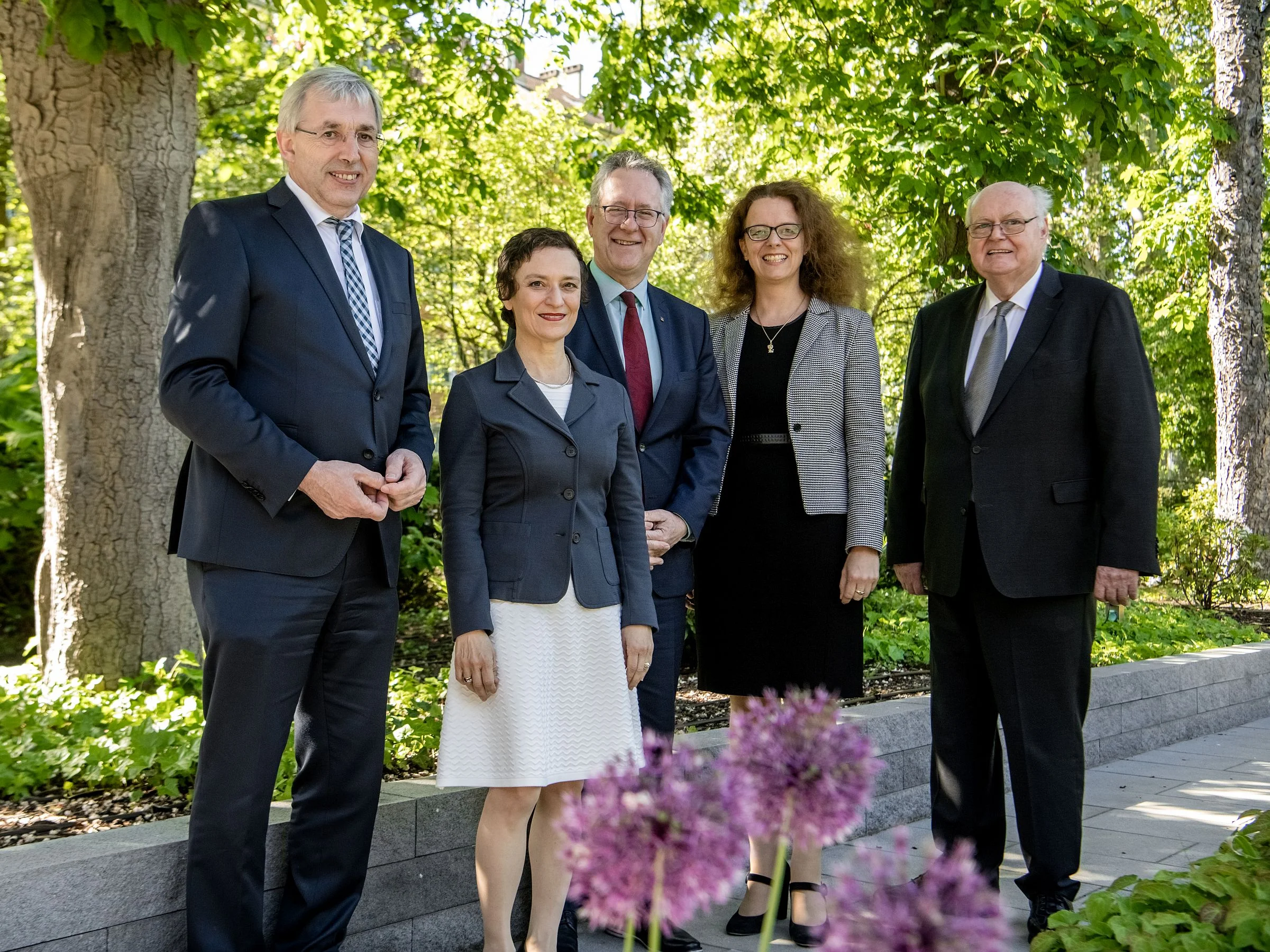 (v.l.) Parlamentarischer Staatssekretär im Ministerium für Kultur und Wissenschaft, Klaus Kaiser, Prof. Dr. Mariacarla Gadebusch Bondio, Rektor Prof. Dr. Dr. h.c. Michael Hoch, Prof. Dr. Isabel Schnabel und Akademiepräsident Prof. Dr. Wolfgang Löwer.