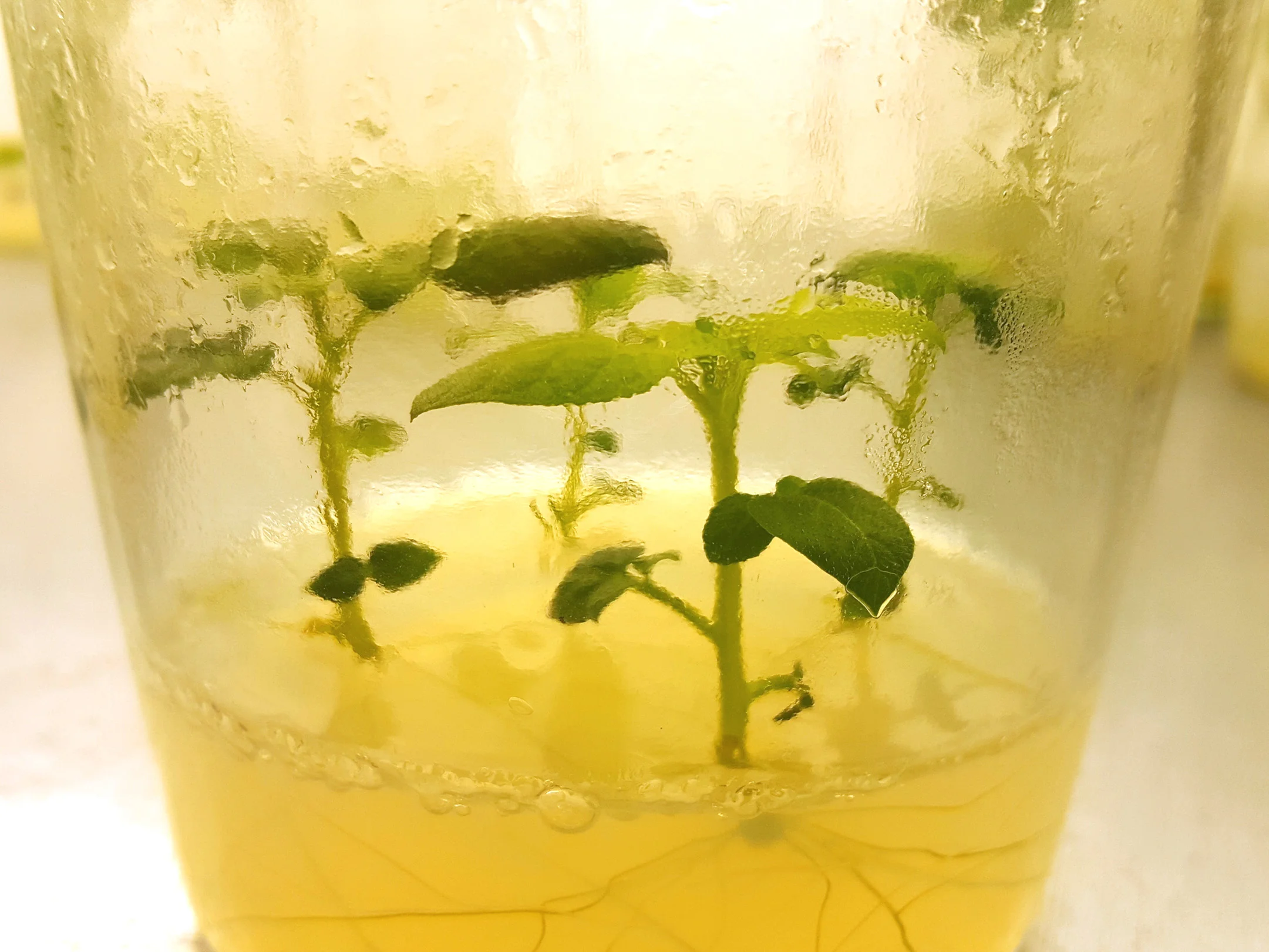 Nahaufnahme von Kartoffelkeimlingen im Anzuchtgefäß: