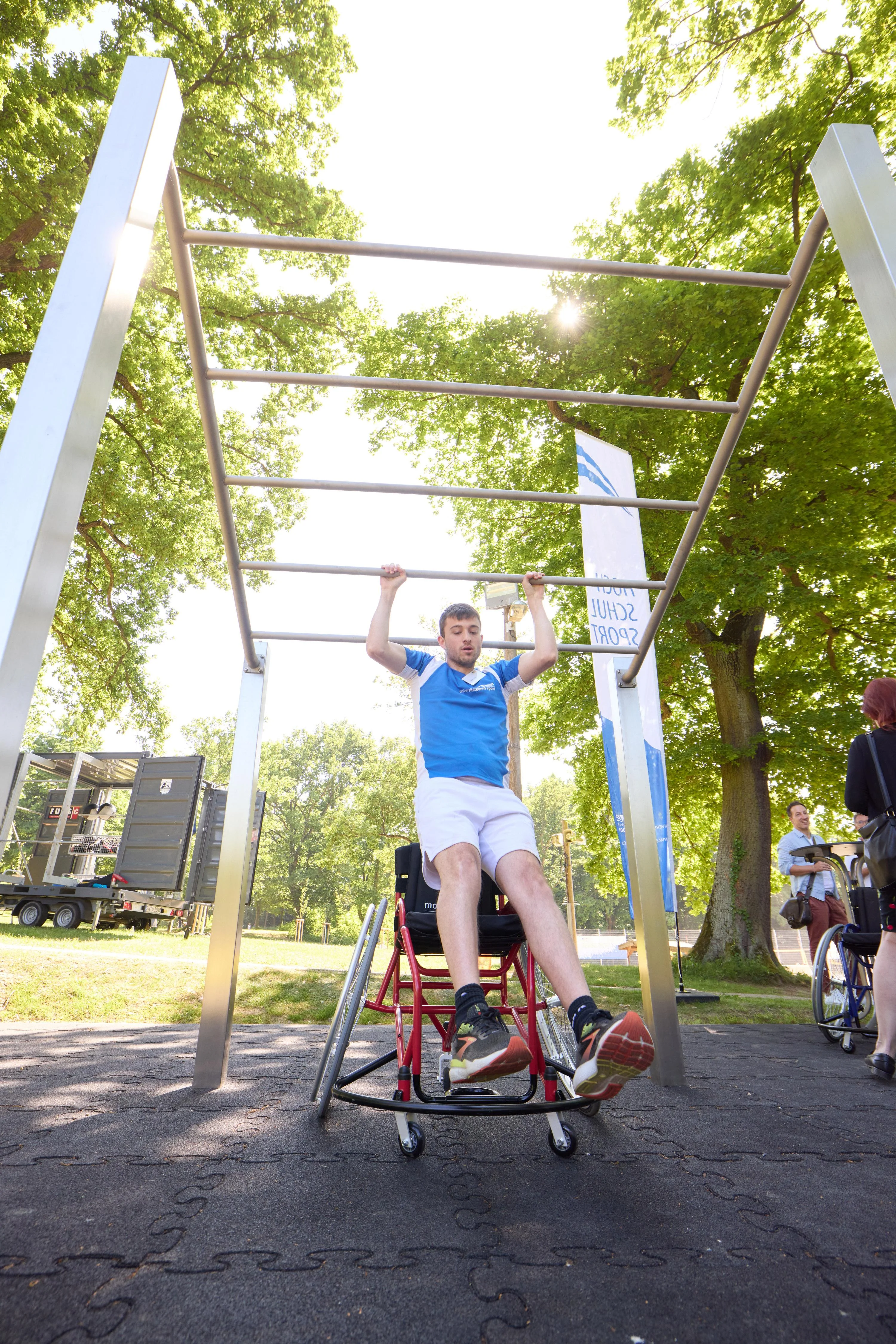 Die Hangelstrecke ist breiter als üblich und hat unterschiedliche Höhenniveaus. Deshalb ist sie auch für Rollstuhlfahrende nutzbar. Fitness_hangelnder Sportler.webp image/webp Typ image/webp Dimension Abmessungen 3000x4500 Size Dateigröße 2.6 MB Herunterladen Bild in voller Größe anzeigen…