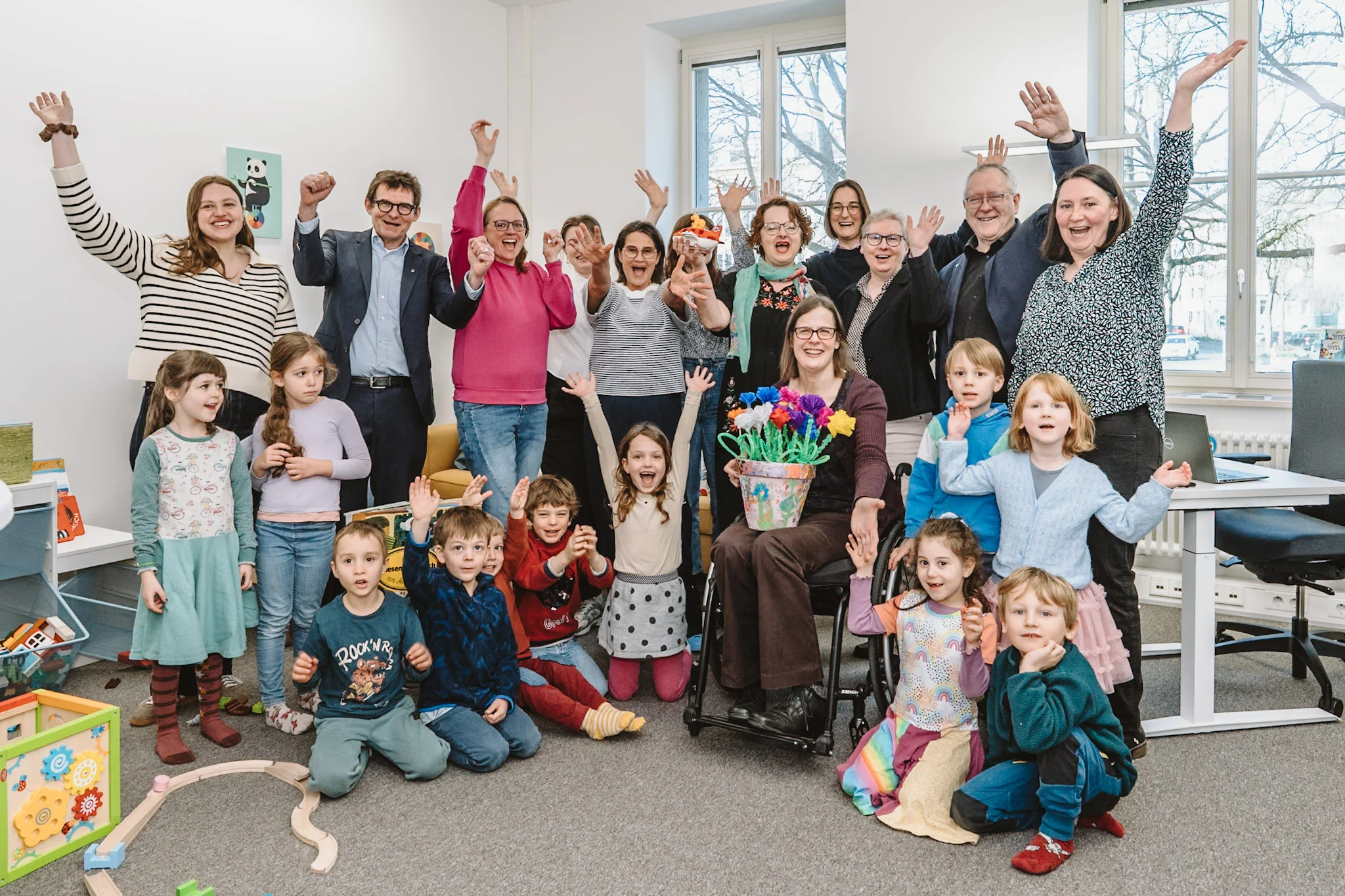 an der Poppelsdorfer Allee: Vertreter und Vertreterinnen der Hochschulleitung und das Team des Familienbüros mit Kita-Kindern, die bei ihrem Besuch einmal alles auf links gedreht und den Raum für gut befunden haben.