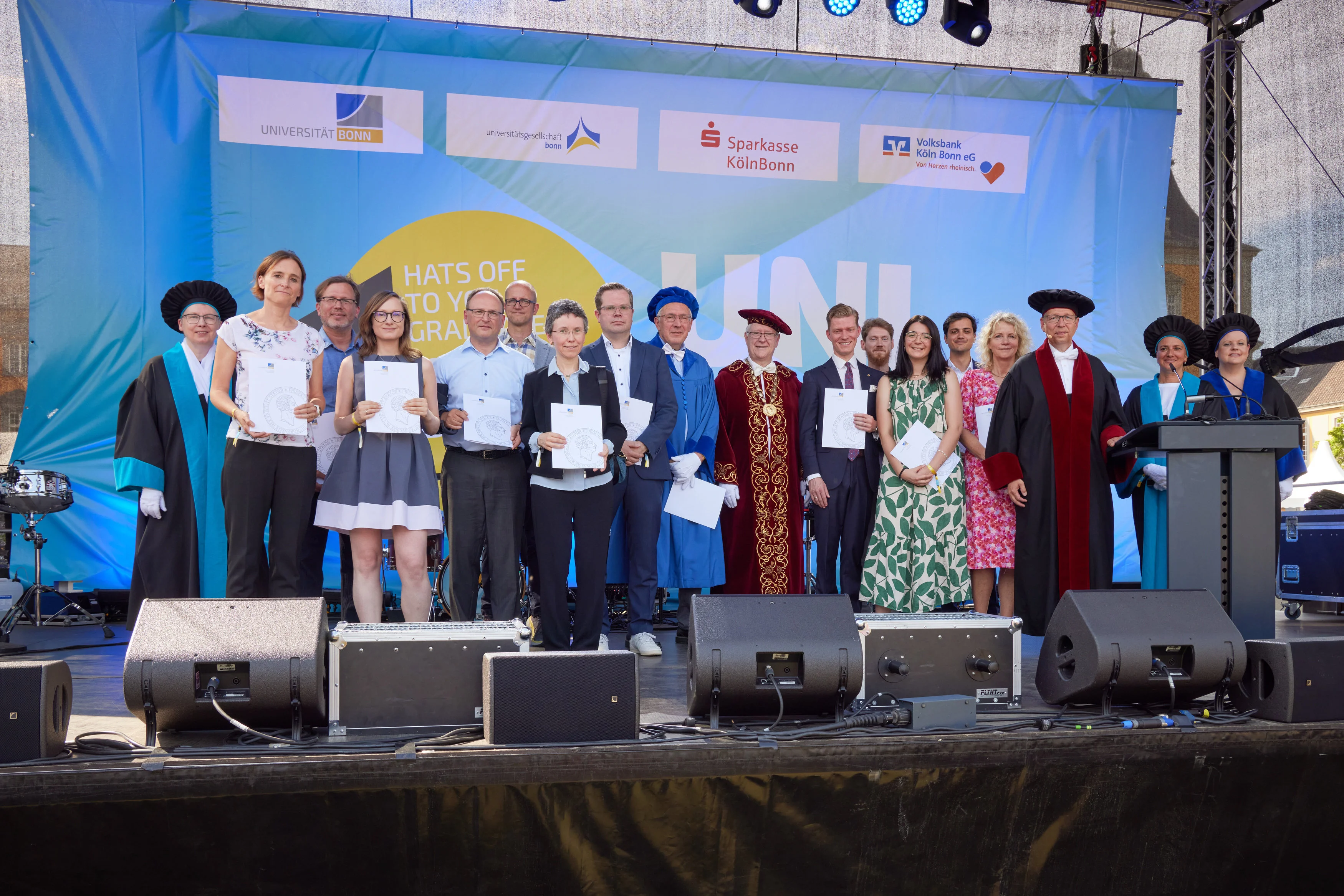 13 of the 14 award-winning teachers received their certificates in person at the university festival. Also in the picture: Dean and award-winner Prof. Walter Witke (light blue gown), Rector Prof. Michael Hoch (red gown), Vice Rector Prof. Irmgard Förster (left, black-blue gown), Vice Rector Prof. Annette Scheersoi (right, black-light blue gown) , Vice Rector Prof. Birgit Ulrike Münch (right, black-dark blue gown) and Vice Rector Prof. Klaus Sandmann (black-red gown).