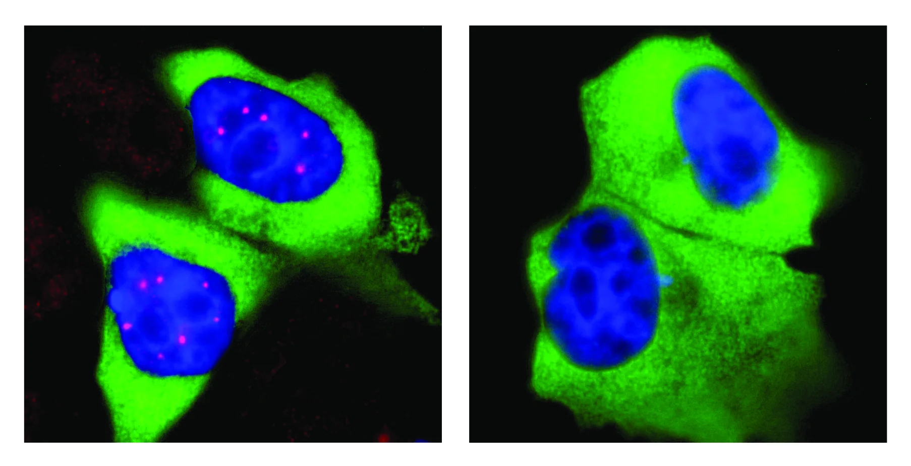 in the Cajal bodies (left, red) in the nucleus of human cells (blue). If phosphorylation of SMN is inhibited, the concentration ceases and Cajal bodies disappear.