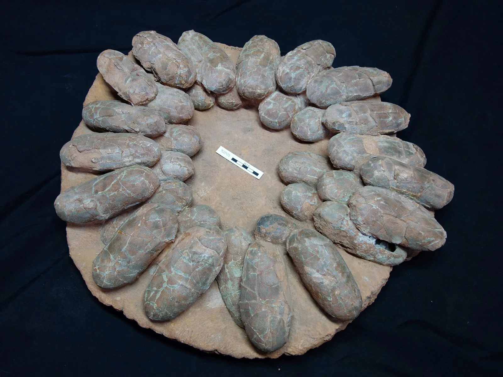 A well-preserved oviraptorid egg clutch from the Late Cretaceous Nanxiong Formation of Jiangxi, China, now housed at the Shishang Museum of Natural History, Xinbei City, Taiwan.
